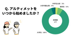 BEGIN ULTIMATEでアルティメット経験者向けに実施したアンケートでは、177件の回答のうち86%が大学生からアルティメットを始めたと答えています。